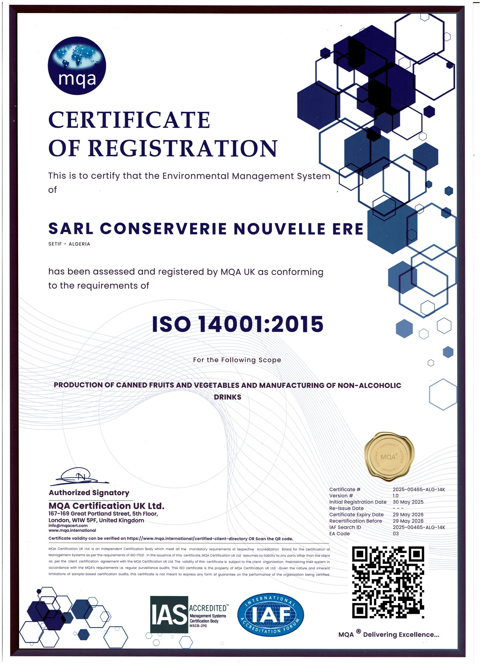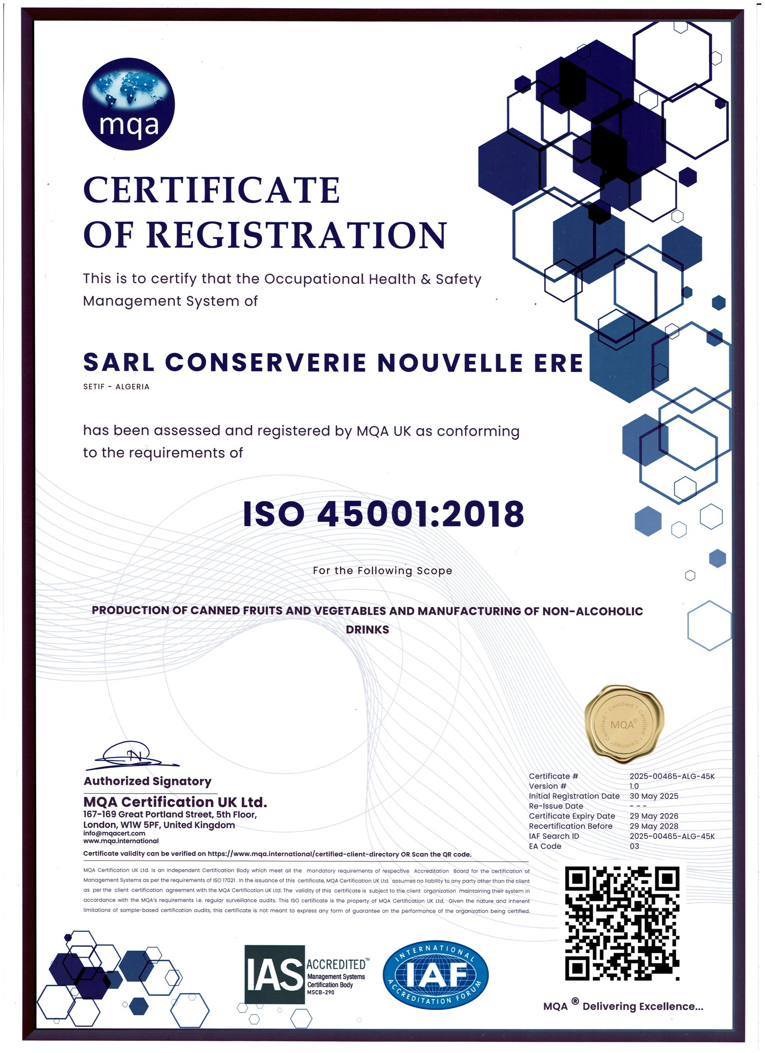 SARL Conserverie Nouvelle Ère (FOUARA) est certifié SMI (45001 santé et sécurité dans le travail, 14001 environnements, 9001 qualités) par un organisme certificateur anglais MQAUK 2025.